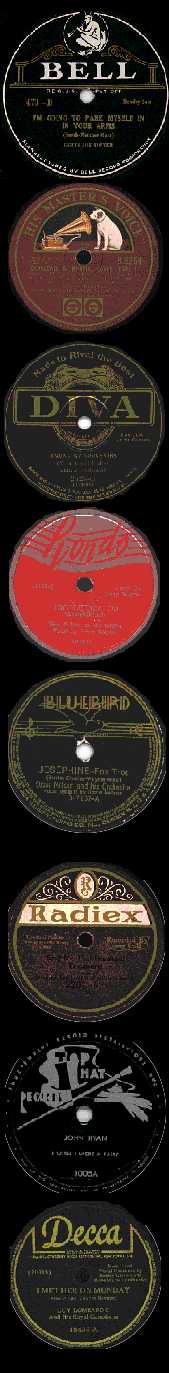 The fact is what I like best about all these records are their labels, and sometimes I look through them just for that reason. I like the deco designs on some of them, especially the lettering, like on the Bluebird and Top Hat labels. My favorite though is "His Master's Voice" with the dog listening to the Victrola, head slightly tilted, with recognition and curiousity. You may not know this but the dog's name was Nipper, and was a creation of an English artist named Francis Barraud, who based it on the unusual interest his pet dog showed in the sounds produced by a gramaphone.